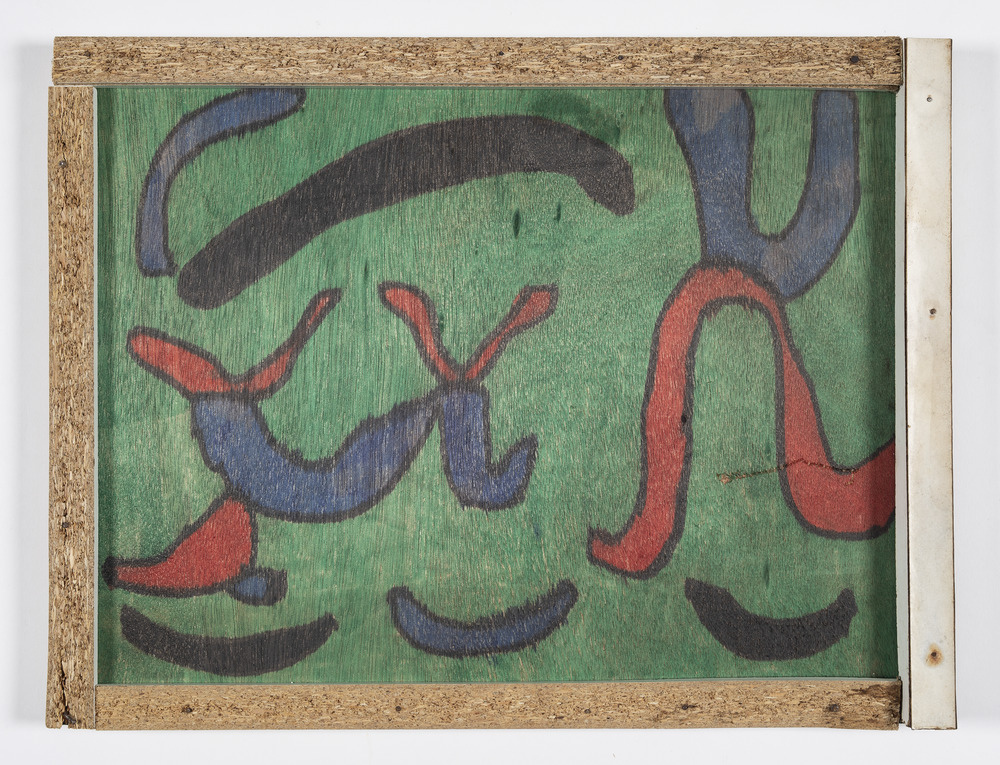 Stylo-feutre sur contreplaqué, clou, aggloméré
